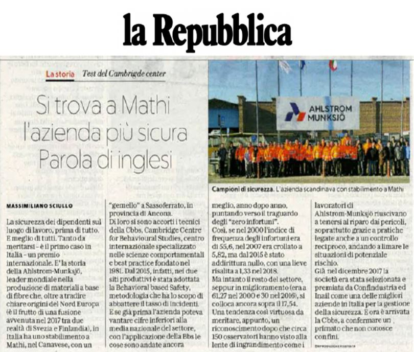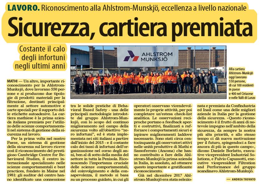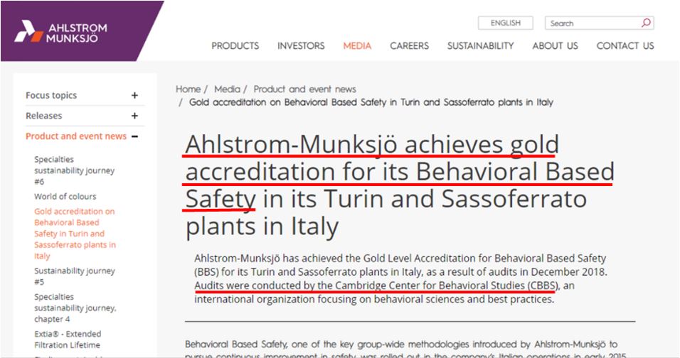 Nel 2018, come ulteriore e sostanziale step all’interno di un lungo percorso fatto di impegno per migliorare la sicurezza dei lavoratori e ridurre gli infortuni sul lavoro, le due cartiere italiane di Mathi (TO) e Sassoferrato (AN) facenti parte della multinazionale Ahlstrom-Munksjo hanno deciso di affrontare la sfida dell’accreditamento da parte del Cambridge Center for Behavioral Studies.